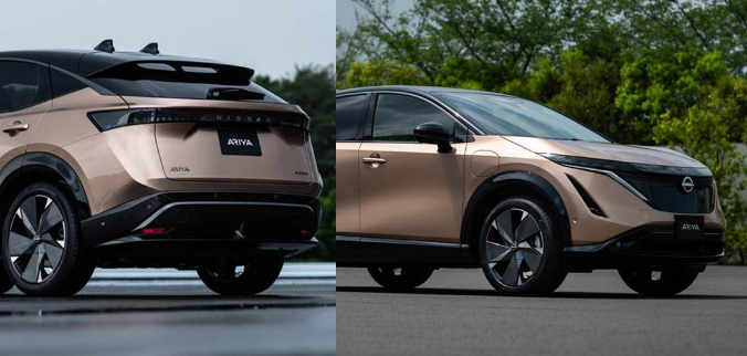 കാറിന്റെ മുൻവശത്ത് ഒരു പുതിയ ‘ഷീൽഡ്’ ഡിസൈൻ ഉണ്ട്, ഒപ്പം മിനുസമാർന്ന പ്രതലത്തിൽ 3 ഡി ‘കുമിക്കോ’ പാറ്റേൺ ഉണ്ട്. ഇത് അനുവദിക്കുന്ന വിപണികളിൽ, നിസ്സാൻ ലോഗോ 20 എൽഇഡികളുള്ള ബാക്ക്ലിറ്റ് ആയിരിക്കും. സൈഡ് പ്രൊഫൈലിന് താഴ്ന്ന സ്ലംഗ് കൂപ്പ് മേൽക്കൂരയുണ്ട്, കാറിന്റെ മുൻഭാഗത്തെയും പിൻഭാഗത്തെയും ബന്ധിപ്പിക്കുന്ന ഒറ്റ, ചക്രവാള രേഖ. പിൻവശത്ത് സവിശേഷമായ സി-പില്ലർ ഡിസൈൻ, ഉയർന്ന മൗണ്ട് ചെയ്ത റിയർ വിംഗ്, വൺ പീസ് ലൈറ്റ് ബാർ എന്നിവയുണ്ട്. 19 ഇഞ്ച് അല്ലെങ്കിൽ 20 ഇഞ്ച് വീലുകളിൽ ഓടിക്കുന്ന അരിയയ്ക്ക് മൾട്ടി-ലിങ്ക് റിയർ സസ്പെൻഷൻ ഉണ്ട്.