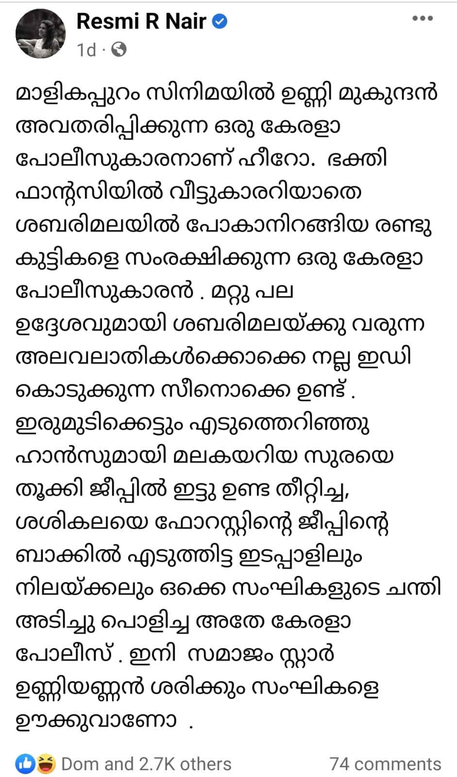മലയാളത്തിലെ സൂപ്പർ താരങ്ങൾ ആയ മോഹൻലാൽ, മമ്മൂട്ടി എന്നിവർക്ക് എതിരെ വിമർശനം നടത്തിയിട്ടുള്ള രശ്മി പലപ്പോഴും സുരേഷ് ഗോപി ചിത്രങ്ങളെ രൂക്ഷമായ ഭാഷയിൽ വിമർശിക്കാറുണ്ട്. സുരേഷ് ഗോപി ചിത്രങ്ങൾ അടക്കം സിനിമ കാണാതെ പോലും വിമർശിക്കുന്ന രശ്മി ആർ നായർ ഇപ്പോൾ നടൻ ഉണ്ണി മുകുന്ദൻ നായകനായി എത്തിയ മാളികപ്പുറം എന്ന ചിത്രത്തിന് എതിരെ ആണ് വിമർശനങ്ങളുമായി എത്തിയിരിക്കുന്നത്.