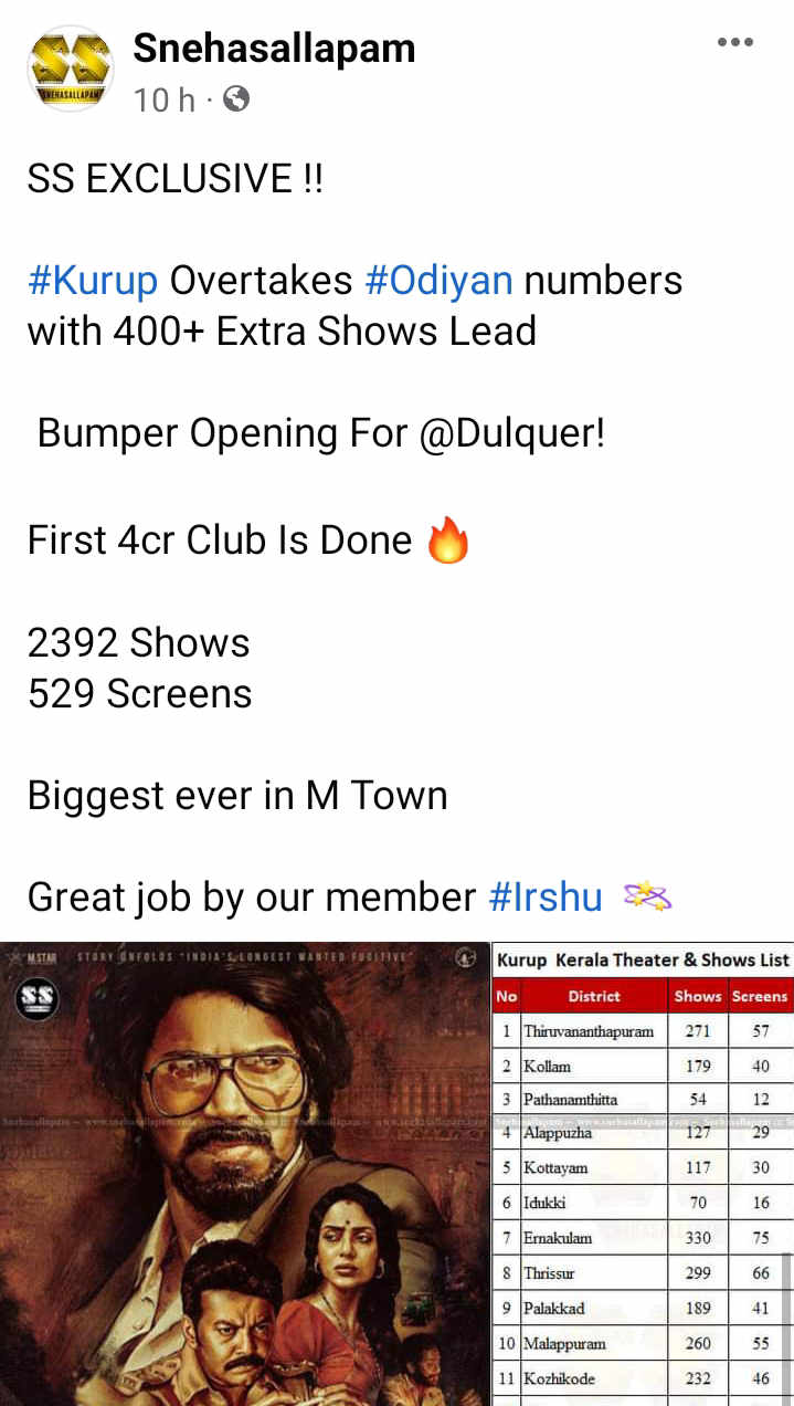 526 സ്ക്രീനിൽ 2356 ഷോ ആണ് ആദ്യ ദിനം കേരളത്തിൽ മാത്രം ദുൽഖർ കളിച്ചത്. ഫിയോക്ക് നേരിട്ട് നടത്തിയ പ്രൊമോഷൻ പരിപാടികൾ കൂടി രാത്രി വൈകിയും കൂടുതൽ ഷോകൾ ചിത്രം കളിക്കുന്നുണ്ട്.