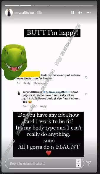 ‘ചിലർ ഇതിന് പണം നൽകുന്നു ചിലർക്ക് സ്വാഭാവികമായും ഇത് ഉണ്ട് ഞങ്ങൾ ചെയ്യേണ്ടത് സുഹൃത്തിനെ കാണിക്കുക എന്നതാണ്! നിങ്ങൾ നിങ്ങളുടേതും കാണിക്കുക. തന്റെ ഇൻസ്റ്റാഗ്രാം സ്റ്റോറികളിൽ ഈ നെഗറ്റീവ് കമന്റുകളുടെ സ്ക്രീൻഷോട്ടുകൾ പങ്കുവെച്ചുകൊണ്ട് ധമാക്കയിൽ കൂടി ശ്രദ്ധ നേടിയ മൃണാൽ ഇങ്ങനെ എഴുതി.