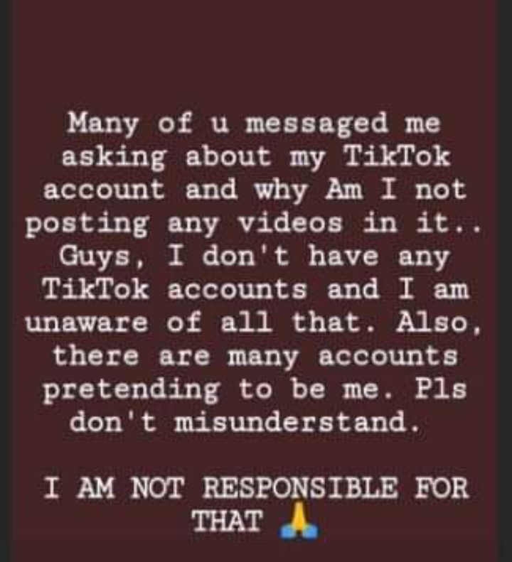 ‘നിരവധി പേർ എനിക്ക് മെസ്സേജ് ആയക്കാറുണ്ട് ഞാൻ ടിക്ക് ടോക്കിൽ ഉണ്ടോ എന്നും എന്തുകൊണ്ട് അതിൽ വീഡിയോ ഒന്നും പോസ്റ്റ് ചെയ്യുന്നില്ലായെന്നും ചോദിക്കാറുണ്ട്. എനിക്ക് ഇതുവരെ ടിക്ക് ടോക്ക് അക്കൗണ്ടുകൾ ഒന്നുമില്ല അതിനെ കുറിച്ച് ഒരു വിവരവുമില്ല.
