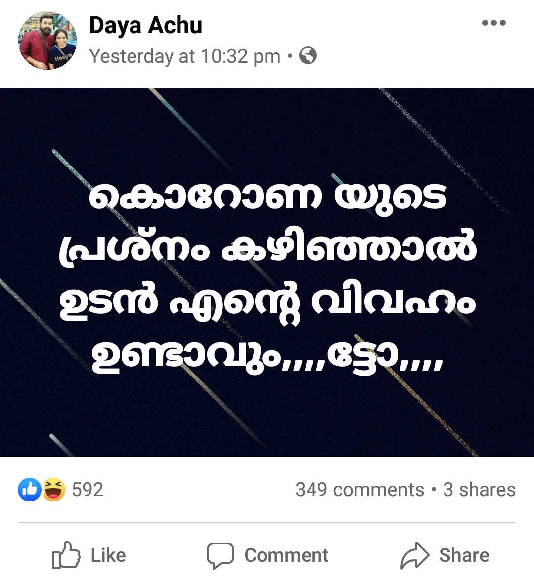 വീണ്ടും വിവാഹിതയാകുന്നു എന്നാണ് കഴിഞ്ഞ ദിവസം സോഷ്യൽ മീഡിയയിൽ കുറിച്ചത്. കൊറോണ പ്രശ്നങ്ങൾ കഴിഞ്ഞാൽ ഉടൻ വിവാഹം ഉണ്ടാവും എന്നാണ് ദയ പറയുന്നത്.
