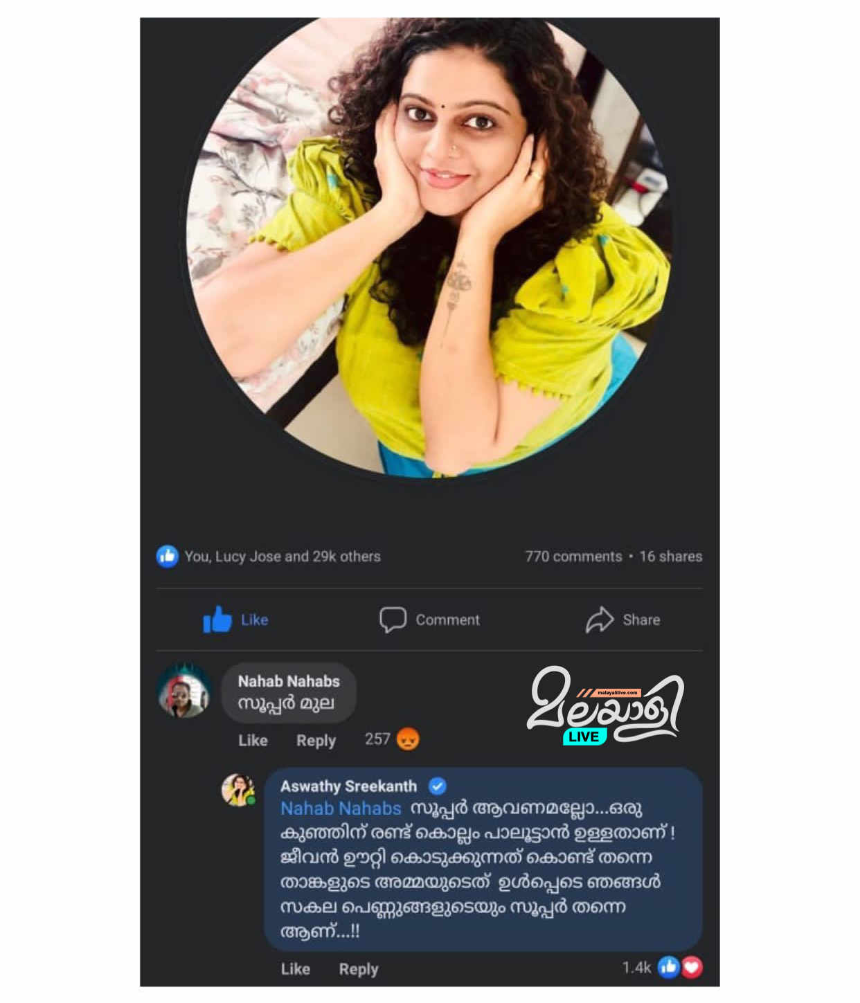 ഒരു കുഞ്ഞിന് രണ്ടു വർഷം പാലൂട്ടാൻ ഉള്ളതാണ്. ജീവൻ ഊറ്റി കൊടുക്കുന്നത് കൊണ്ട് തന്നെ താങ്കളുടെ അമ്മയുടേത് ഉൾപ്പെടെ ഞങ്ങൾ സകല പെണ്ണുങ്ങളുടെയും സൂപ്പർ തന്നെയാണ്. കമന്റ് വിവാദമായതോടെ യുവാവ് അശ്വതിയോട് മാപ്പ് പറഞ്ഞിരുന്നു.