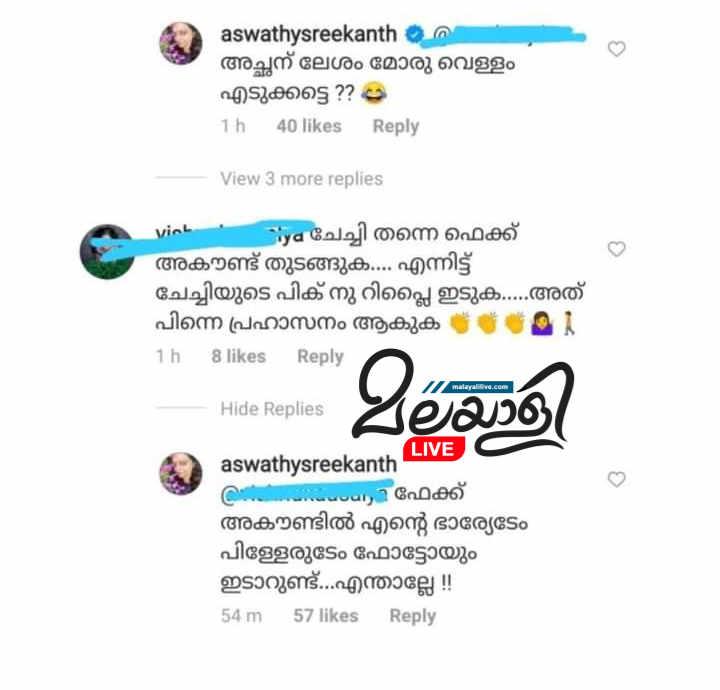 ഫേക്ക് അക്കൗണ്ടിൽ ഞാൻ എന്റെ ഭാര്യയുടെയും പിള്ളേരുടെയും ഫോട്ടോയും ഇടാറുണ്ട് എന്താലേ.. അശ്വതി ശ്രീകാന്ത് പോസ്റ്റിന് നൽകിയ മറുപടി ഇൻസ്റ്റാഗ്രാമിൽ കൂടി ആണ് ഷെയർ ചെയ്യുക ആയിരുന്നു.