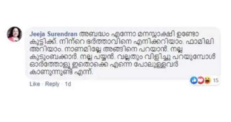 അബദ്ധം എന്നോ മനസാക്ഷിയുണ്ടോ കുട്ടിക്ക് നിന്റെ ഭർത്താവിനെ എനിക്കറിയാം ഫാമിലി അറിയാം.. നാണമില്ലേ അങ്ങിനെ പറയാൻ നല്ല കുടുംബക്കാർ ആണ്. നല്ല പയ്യൻ. വല്ലതും പറയുമ്പോൾ ഓർത്തോളൂ ഇതൊക്കെ എന്നെ പോലെയുള്ളവർ കാണുന്നുണ്ട്. എന്ന്” എന്നുപറഞ്ഞുകൊണ്ടാണ് ജീജ രംഗത്ത് വന്നത്.