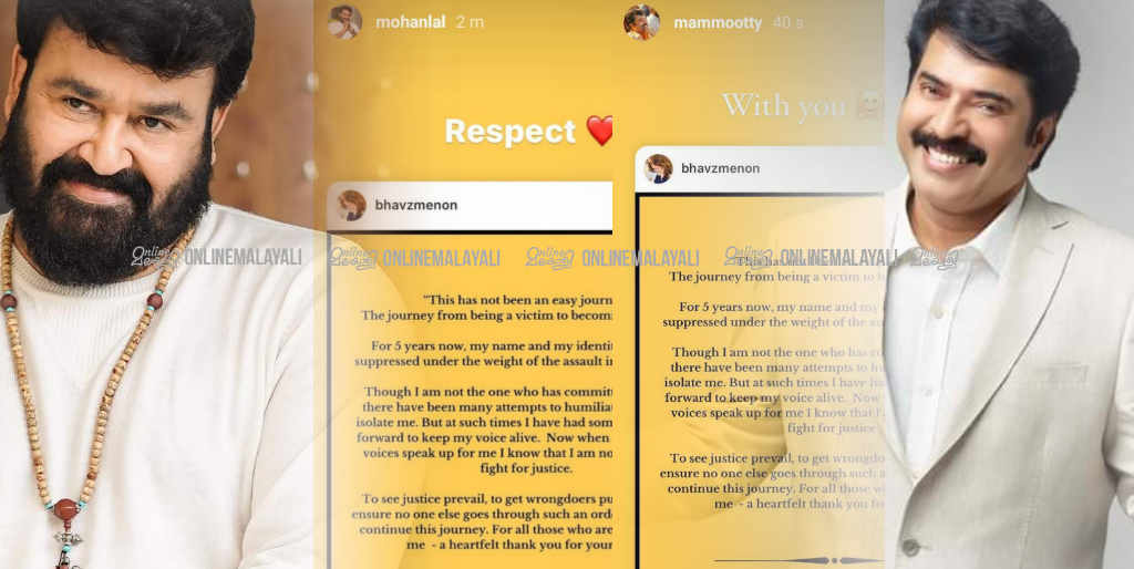 അവസാനം നടിക്ക് പിന്തുണയുമായി മോഹൻലാലും മമ്മൂട്ടിയും എത്തി. ഇന്നലെ രാത്രിയുടെ ആണ് നടിക്ക് പിന്തുണ നൽകി ഇൻസ്റ്റാഗ്രാം സ്റ്റോറിയുമായി അമ്മ പ്രസിഡന്റ് കൂടി ആയ മോഹൻലാലും മലയാള സിനിമയിലെ മുതിർന്ന താരം മമ്മൂട്ടിയും എത്തിയത്.