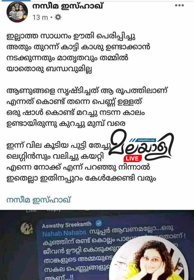 കമന്റ് വിവാദമായതോടെ യുവാവ് അശ്വതിയോട് മാപ്പ് പറഞ്ഞിരുന്നു. എന്നാൽ ആ പോസ്റ്റിനും ശക്തമായ പ്രതികരണം വന്നതോടെ യുവാവ് തന്റെ ഫേസ്ബുക് പ്രൊഫൈൽ ഡിലീറ്റ് ചെയ്തു. എന്നാൽ നസീമ ഈസഹാഖ് എന്ന യുവതി ഇപ്പോൾ അശ്വതിക്ക് എതിരെ പോസ്റ്റുമായി രംഗത്ത് വന്നിരിക്കുന്നത്.