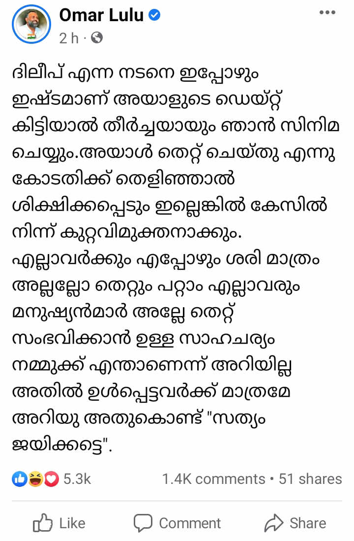 എന്നാൽ ഈ വിഷയത്തിൽ ഇപ്പോൾ ദിലീപിനെ ന്യായീകരിക്കുന്ന പോസ്റ്റുമായി എത്തി ഇരിക്കുകയാണ് സംവിധായകൻ ഒമർ ലുലു. ഹാപ്പി വെഡിങ്സ് , ചങ്ക്സ് , ഒരു അടാർ ലവ് തുടങ്ങിയ ചിത്രങ്ങളുടെ സംവിധായകൻ ആണ് ഒമർ ലുലു. ദിലീപിനെ വെച്ച് ഒരു സിനിമ ചെയ്യുന്ന മോഹം നേരത്തെ ഒമർ ലുലു പങ്കുവെച്ചിരുന്നു.