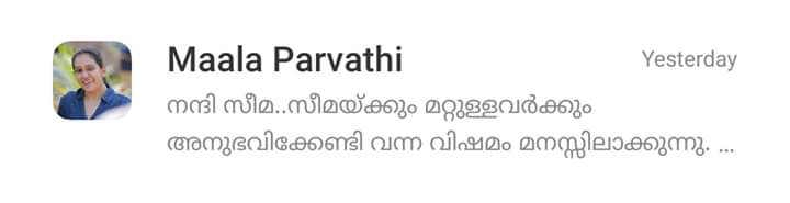 ഈ പോസ്റ്റിന് ശേഷം സീമ വിനീത് ലൈവിൽ എത്തി വിശദീകരണം നൽകി എങ്കിൽ കൂടിയും തുടർന്ന് മാല പർവതിയുടെയും മകന്റെയും പേരും സന്ദേശങ്ങളുടെ സ്ക്രീൻ ഷോട്ട് അടങ്ങുന്ന വിവരങ്ങളും അടക്കം ഉള്ള പോസ്റ്റ് ആയി സീമ വീണ്ടും എത്തി. ആ പോസ്റ്റ് ഇങ്ങനെ..