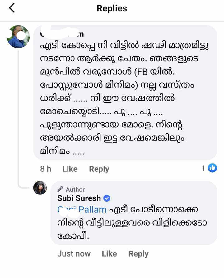 ഈ പോസ്റ്റിൽ ആണ് പ്രായമേറിയ ഒരാൾ മോശം കമന്റ് ആയി എത്തിയത്. ഇനി കോപ്പേ നീ വീട്ടിൽ ഷഡി മാത്രം ഇട്ട നടന്നോ ആർക്കു ചേതം. ഞങ്ങളുടെ മുന്നിൽ വരുമ്പോൾ നല്ല വസ്ത്രങ്ങൾ ധരിക്കൂ. നീ ഈ വേഷത്തിൽ മോചെയ്യോടി പു പു പുളുന്താണുണ്ടായ മോളെ.. നിന്റെ അയൽക്കാരി ഇട്ട വേഷം മിനിമം.. എന്നാൽ എടി പൊടി എന്നൊക്കെ നിന്റെ വീട്ടിലുള്ളവരെ വിളിക്കാടോ കോപി എന്നാണ് സുബി കമന്റ് ചെയ്തത്.