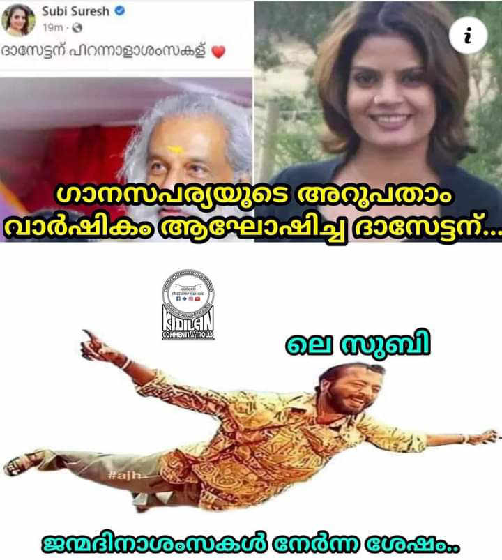 കഴിഞ്ഞ ദിവസം നമ്മുടെ പേജിൽ ‘ദാസേട്ടന് പിറന്നാളാശംസകൾ’ എന്ന പോസ്റ്റ് നമ്മുടെ പേജ് മാനേജ് ചെയ്യുന്ന പുതിയ പയ്യന് പറ്റിയ ഒരു അബദ്ധമാണ്. ‘ദാസേട്ടന് ആശംസകൾ’ എന്നതിനു പകരം പിറന്നാളാശംസകൾ എന്നു തെറ്റി പോസ്റ്റിടുകയാണുണ്ടായത്. തെറ്റ് തെറ്റു തന്നെയാണ്. അതില് ഞാൻ നിർവ്യാജം ഖേദിക്കുന്നു. അതോടൊപ്പം ട്രോളന്മാർക്ക് നന്ദി. സുബി പറയുന്നു.