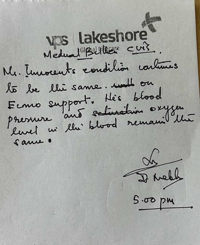 ഇസിഎംഓ സഹായത്തിൽ ആണ് ഇന്നസെന്റ് ഇപ്പോഴും ആശുപത്രിയിൽ തുടരുന്നത്. അർബുദത്തെ തുടർന്ന് ഉണ്ടായ ചില ശാരീരിക അസ്വസ്ഥതകൾ മൂലമാണ് അദ്ദേഹത്തെ ആശുപത്രിയിൽ പ്രവേശിപ്പിച്ചത്.