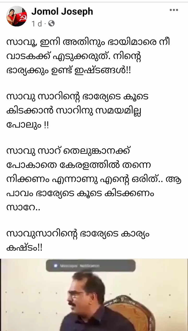 ഇതിനോടകം തന്നെ ജോമോളുടെ പ്രതികരണം വൈറലായി മാറിയിരുന്നു. സാവൂ ഇനി അതിനും ഭായിമാരെ നീ വാടകക്ക് എടുക്കരുത്. നിന്റെ ഭാര്യക്കും ഉണ്ട് ഇഷ്ടങ്ങൾ. സാവു സാറിന്റെ ഭാര്യേടെ കൂടെ കിടക്കാൻ സാറിനു സമയമില്ല പോലും . സാവു സാറ് തെലുങ്കാനക്ക് പോകാതെ കേരളത്തിൽ തന്നെ നിക്കണം എന്നാണു എന്റെ ഒരിത്. ആ പാവം ഭാര്യേടെ കൂടെ കിടക്കണം സാറേ.